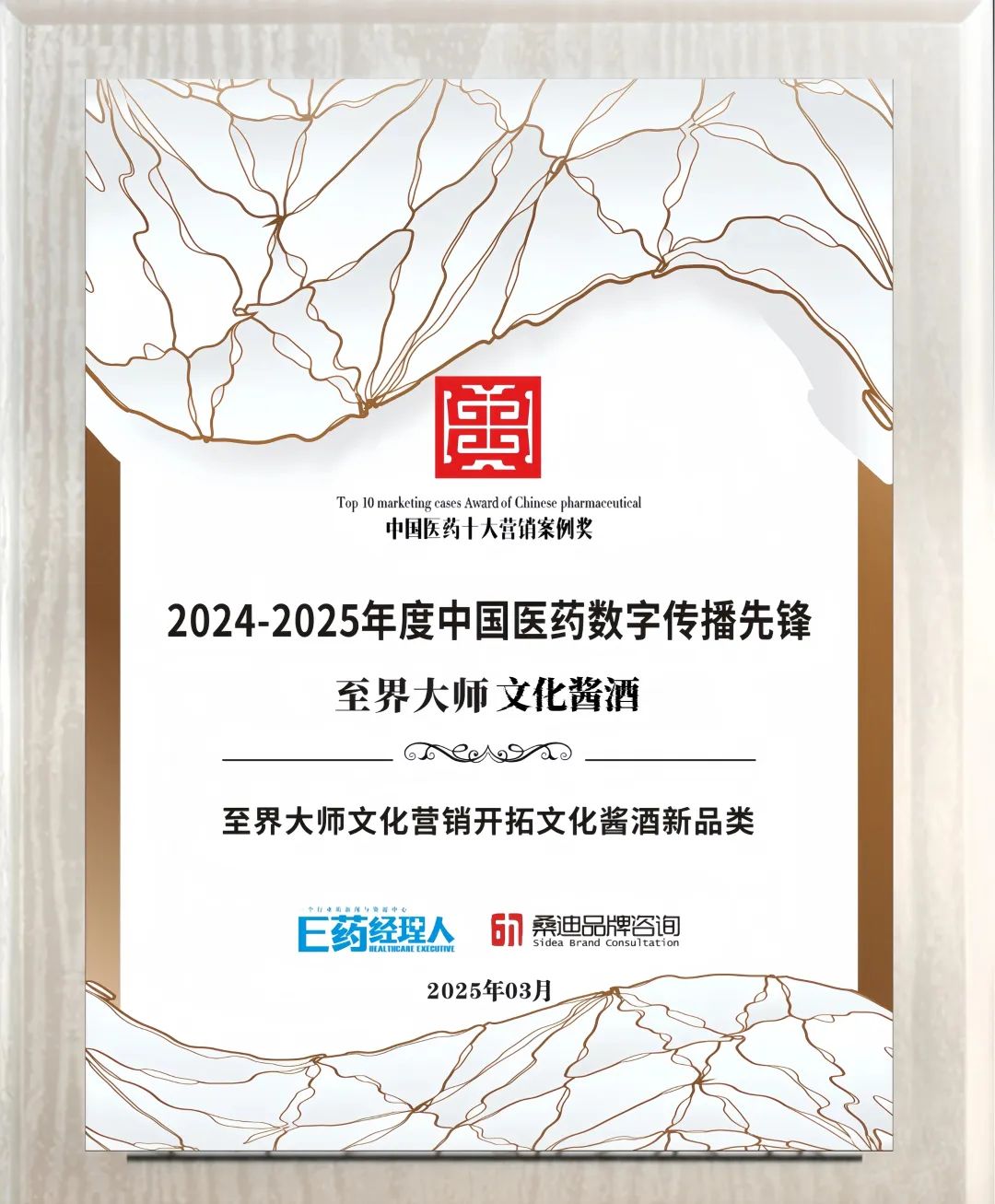 作为大会的重要组成部分,2024大健康产业大国品牌高峰论坛在3月26日晚隆重举行。会上,“2024-2025年度中国医药十大营销案例”揭榜。本次评选活动由《大国品牌》、E药经理人、桑迪品牌咨询联合主办。至界大师酒业凭借在文化传承创新与数字化传播领域的卓越表现,荣获"2024-2025年度中国数字传播先锋奖"。